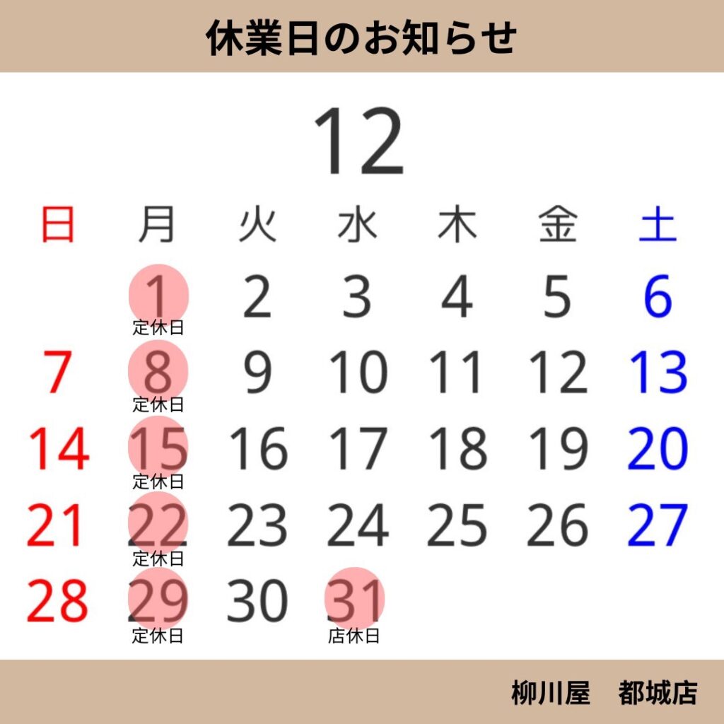 12月の定休日のお知らせです。