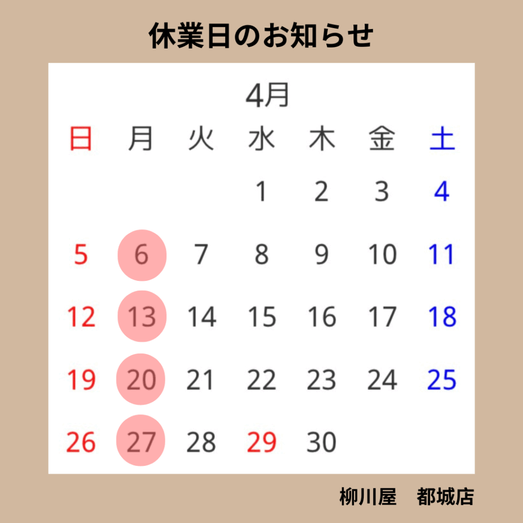 当店は、祝祭日関わらず、毎週月曜日が定休日となります。